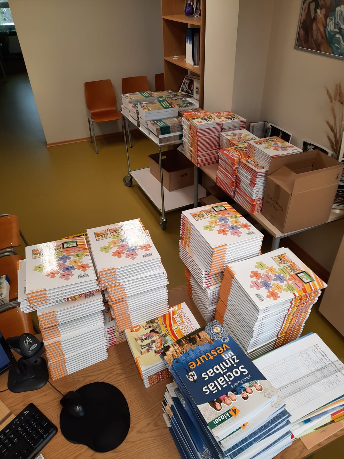 Šajā saspringtajā laikā skolas bibliotēkas turpina darbu, lai īstenotu jaunās kompetenču izglītības nodrošināšanu mūsu skolā. Iegādāti jau 765 eksemplāri jauno mācību grāmatu dažādos priekšmetos 1., 4., 7. klasēm. Kā jau parasti, jaunās grāmatas arī ievākojam, lai paildzinātu to lietošanas ilgmūžību un aiztaupītu šo nebūt ne vieglo procesu mūsu skolēniem un vecākiem. Izsniegšanu organizējam veidā, lai saņēmējiem nebūtu jādrūzmējas, un tiktu ievēroti drošības noteikumi.