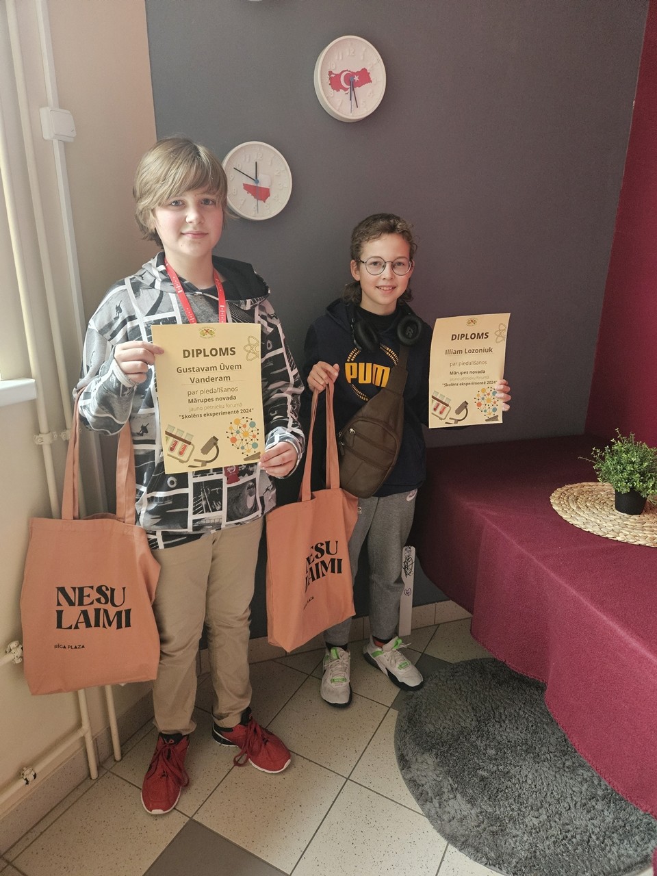 Diplomu par piedalīšanos saņēma 6.klases skolēni Gustavs Ūve Vanders un Illja Lozuniku ar eksperimentu “Pārsteidzošais rats”. (video )