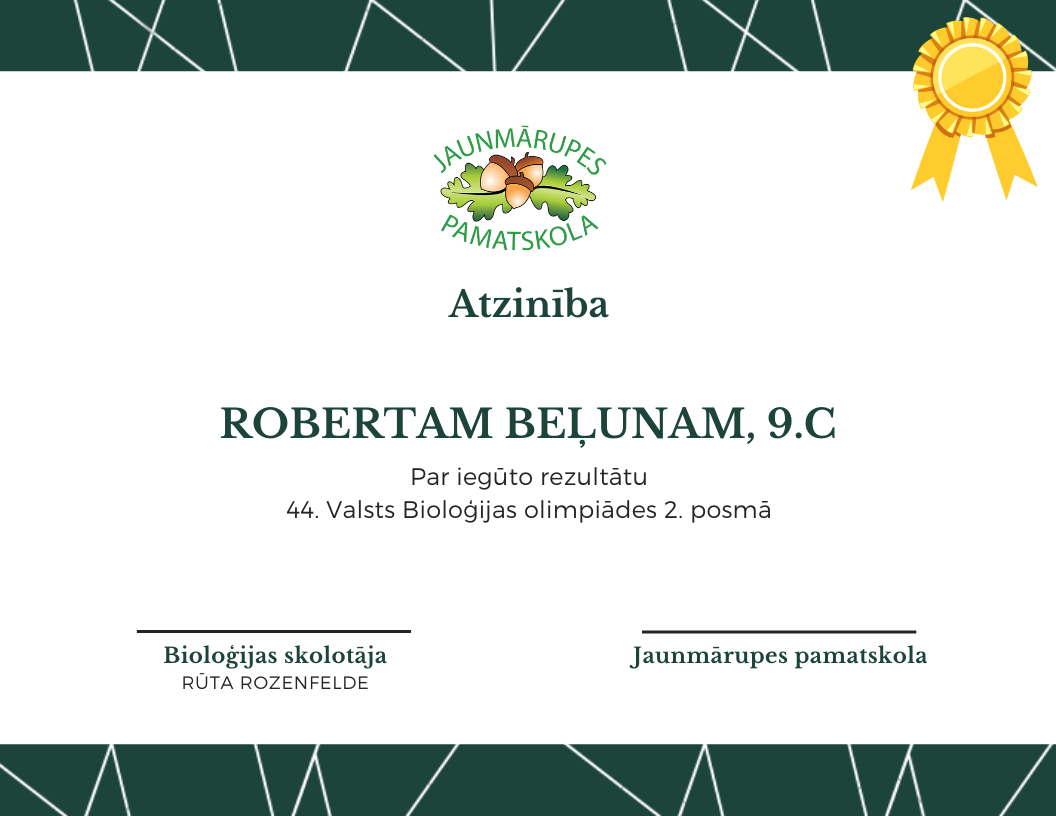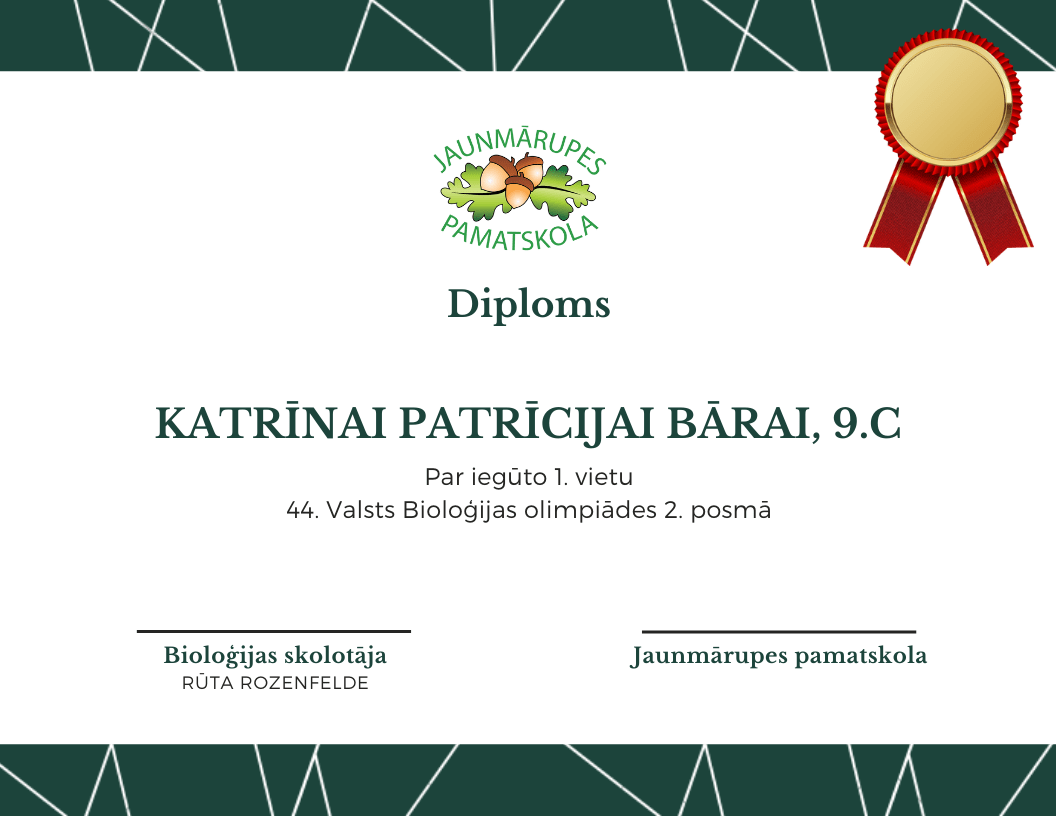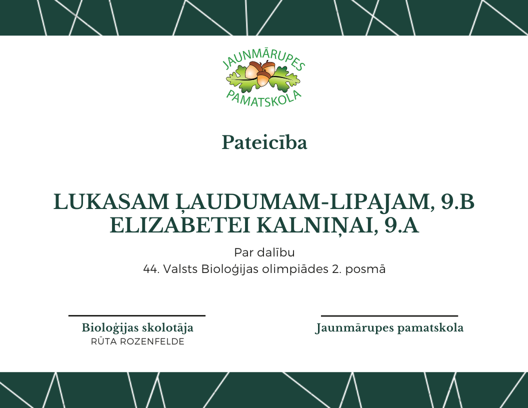 Kā jau katru gadu, Pierīgas bioloģijas olimpiādes posmā pjedestāli rotā Jaunmārupes pamatskolas skolēnu vārdi. Šogad, 44. Valsts bioloģijas olimpiādes 2. posmā piedalījās četri skolēni – Elizabete Kalniņa (9.a), Lukass Ļaudums-Lipajs (9.b), Katrīna Patrīcija Bāra (9.c) un Roberts Beļuns (9.c). Paldies visiem skolēniem par divu gadu laikā ieguldīto darbu, gatavojoties šai olimpiādei! Pierīgas IKSP atzinību par augstiem rezultātiem ieguva Roberts Beļuns (9.c), savukārt 1. vietu ar visaugstāko punktu skaitu 9. klašu konkurencē ieguva Katrīna Patrīcija Bāra (9.c). Novēlām Katrīnai izturību gatavojoties un veiksmi piedaloties Valsts bioloģijas olimpiādes 3. posmā, sacenšoties ar visas Latvijas gudrākajiem bioloģijas skolēniem!
