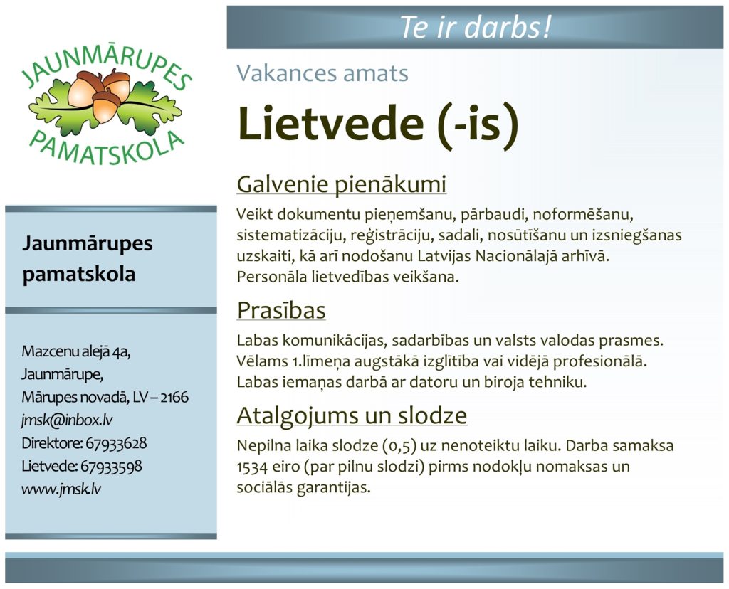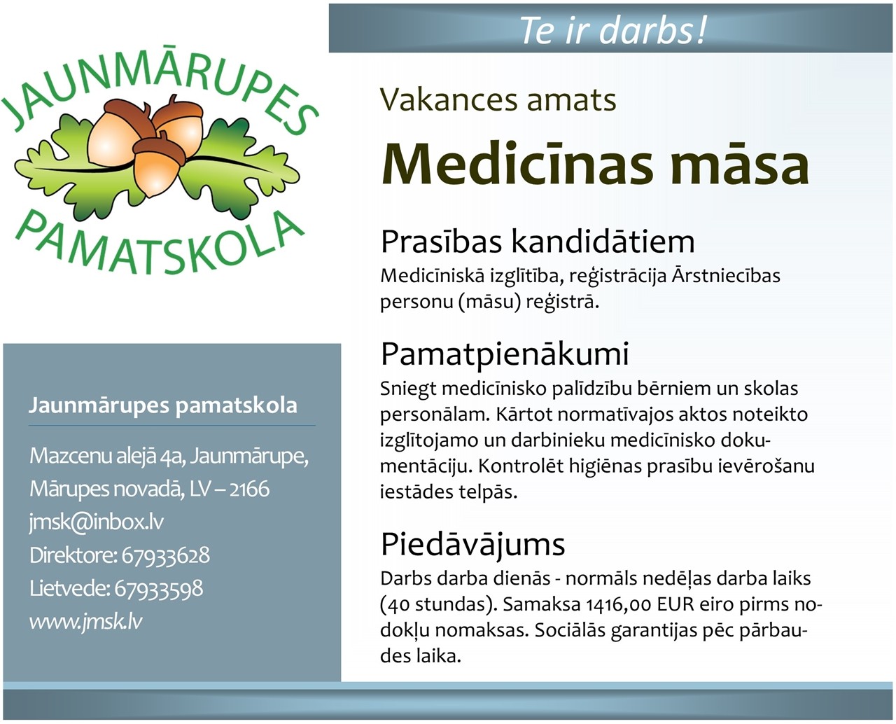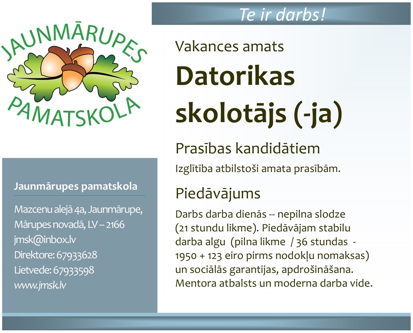 Aktuālās vakances Ja vēlies strādāt radošā, atsaucīgā un draudzīgā kolektīvā, nāc un pievienojies! Jaunmārupes pamatskola Mazcenu alejā 4a, Jaunmārupe, Mārupes novadā, LV – 2166 jmsk@inbox.lv Direktore: 67933628 Lietvede: 67933598 www.jmsk.lv