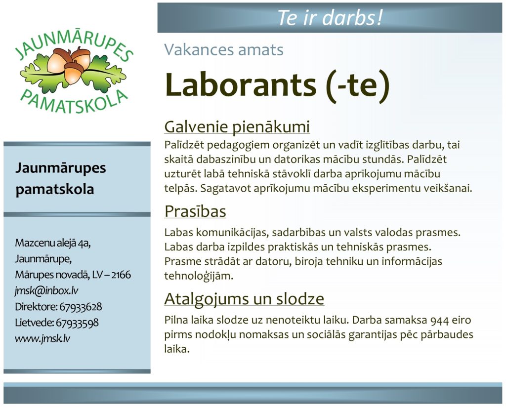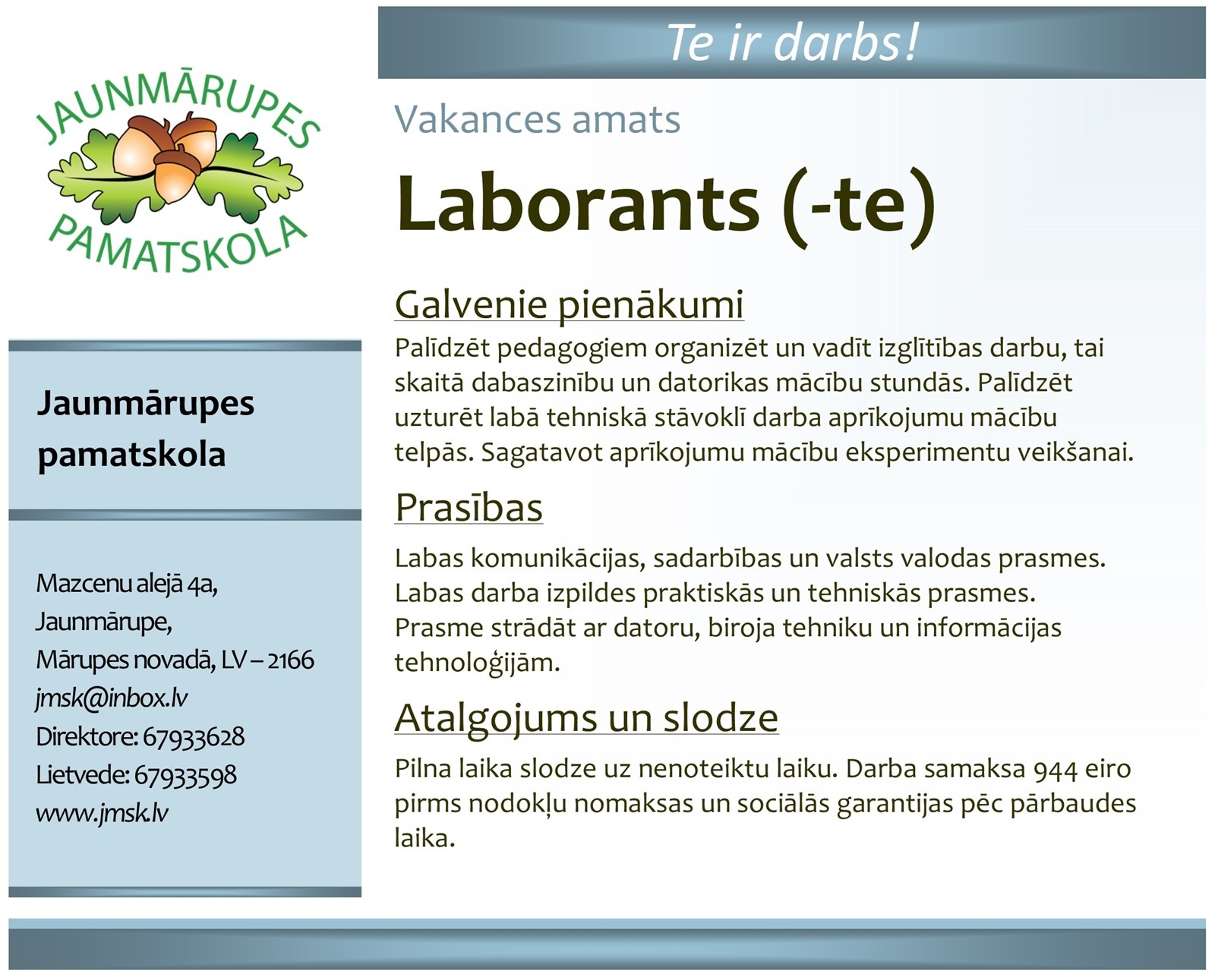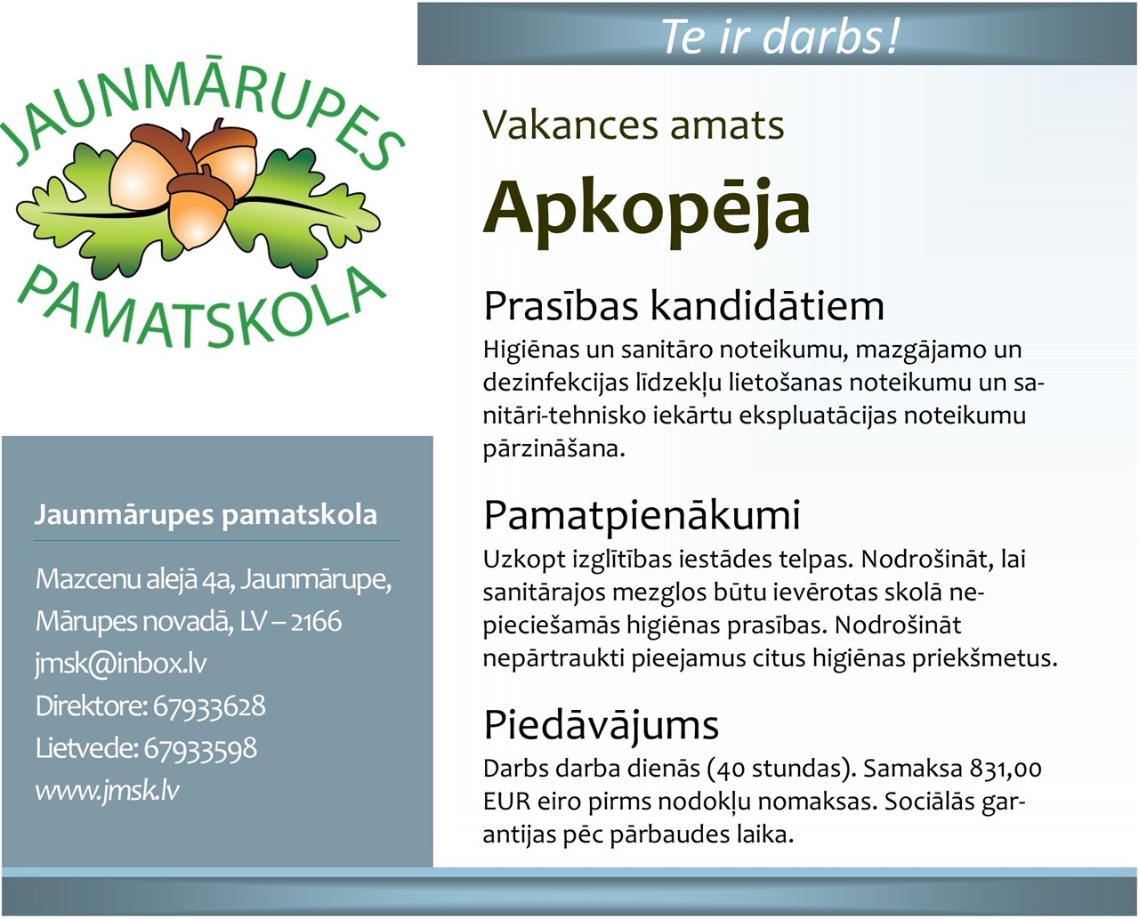 Aktuālās vakances Ja vēlies strādāt radošā, atsaucīgā un draudzīgā kolektīvā, nāc un pievienojies! Jaunmārupes pamatskola Mazcenu alejā 4a, Jaunmārupe, Mārupes novadā, LV – 2166 jmsk@inbox.lv Direktore: 67933628 Lietvede: 67933598 www.jmsk.lv