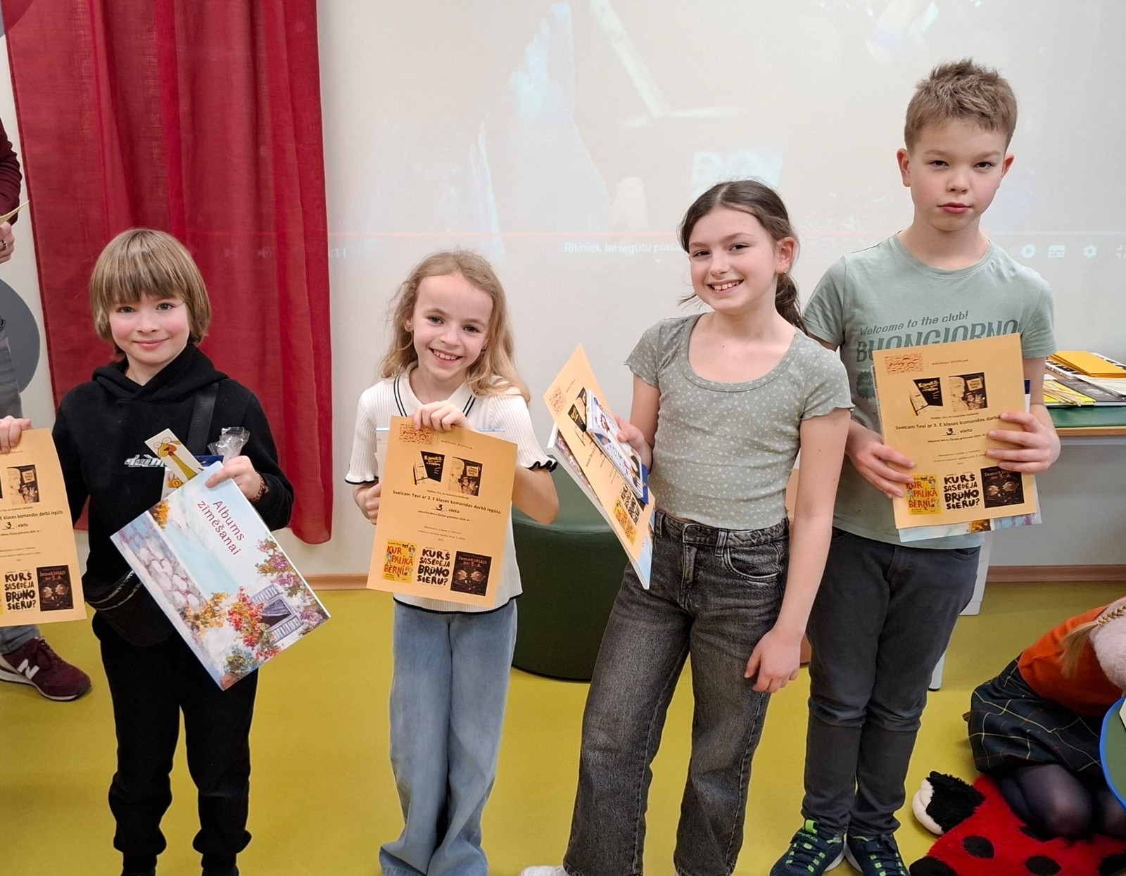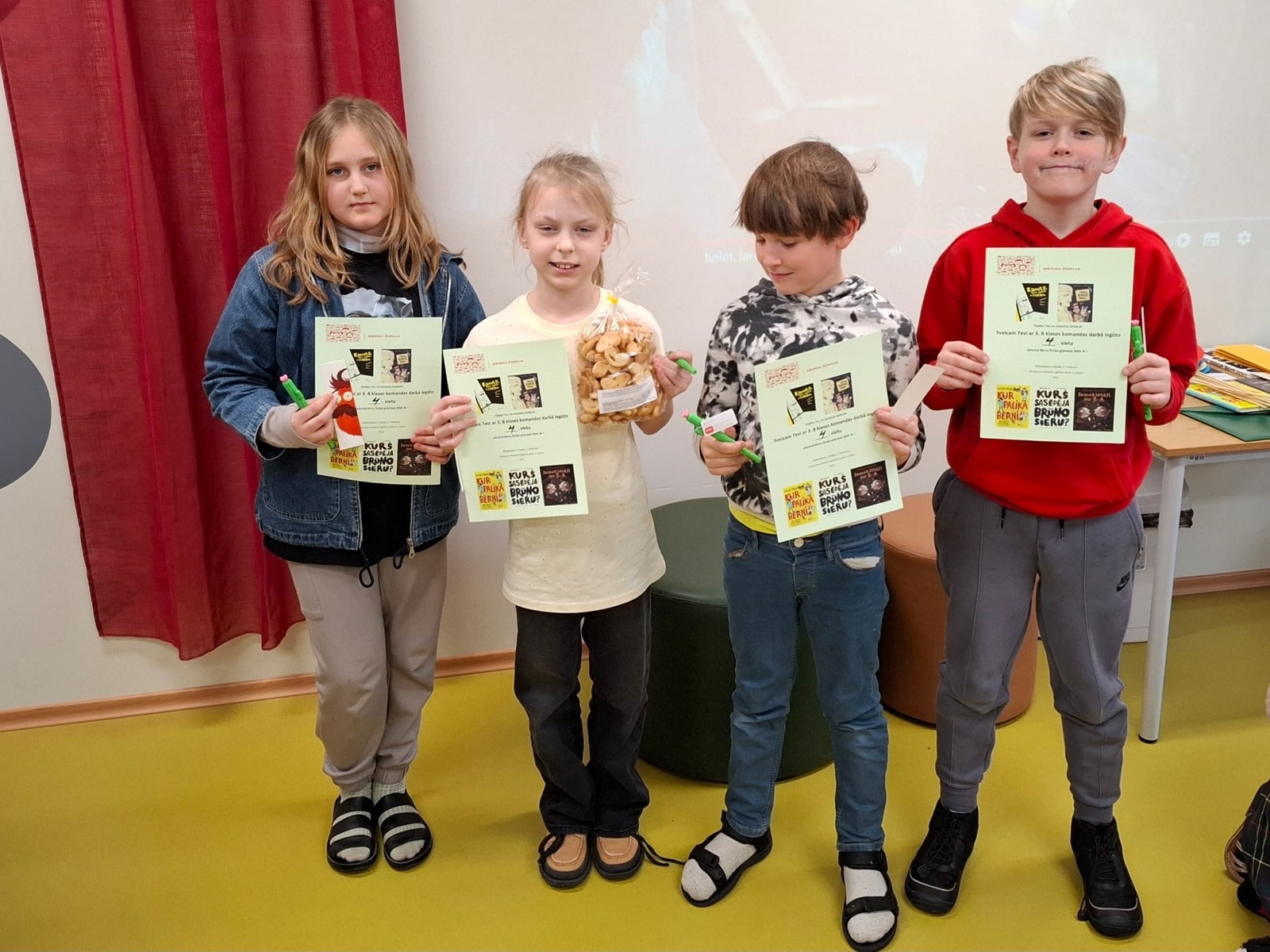 Nelielas sāncensības atmosfērā trešo klašu čaklākie Bērnu Žūrijas 2024 9+ grāmatu lasītāji tikās skolas 4.-9. klašu bibliotēkā, lai viktorīnā demonstrētu savas zināšanas par šo grāmatu tēliem, notikumiem, autoriem un atbildētu uz dažādiem āķīgiem jautājumiem!